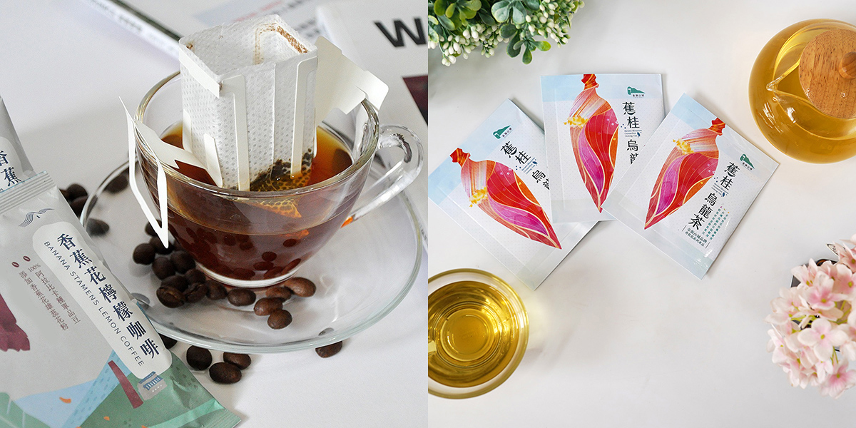 ■香蕉花檸檬濾掛式咖啡:旗山糖廠社區以保證收購價向農民收購香蕉花,委請生醫公司生產香蕉花檸檬咖啡。中烘焙阿拉比卡單品豆,加入檸檬和富含花青素、水溶性纖維的香蕉花,熱沖冷飲風味如無糖之西西里檸檬咖啡。以清新果酸調性重塑咖啡印象,檸檬香提亮整體香氣。滋味兼具在地農產特色與精品咖啡質感,既保有咖啡醇厚,更展現創新檸檬平衡,突破一般調味咖啡框架,獲交通部觀光署伴手禮獎以及南科永續商品福委推薦商品。